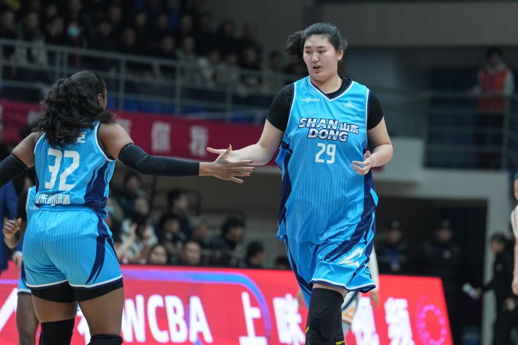 1月4日,山东队球员张子宇(右)在比赛中和队友击掌。新华社记者 朱峥 摄