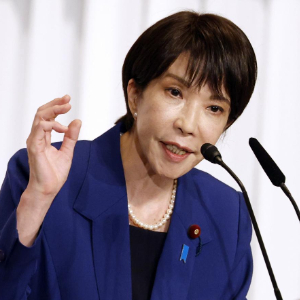 9月22日,在日本东京,高市早苗在自民党总裁选举政见发表演讲会上发言。新华社发(Pool图片,弗兰克·罗比雄摄)
